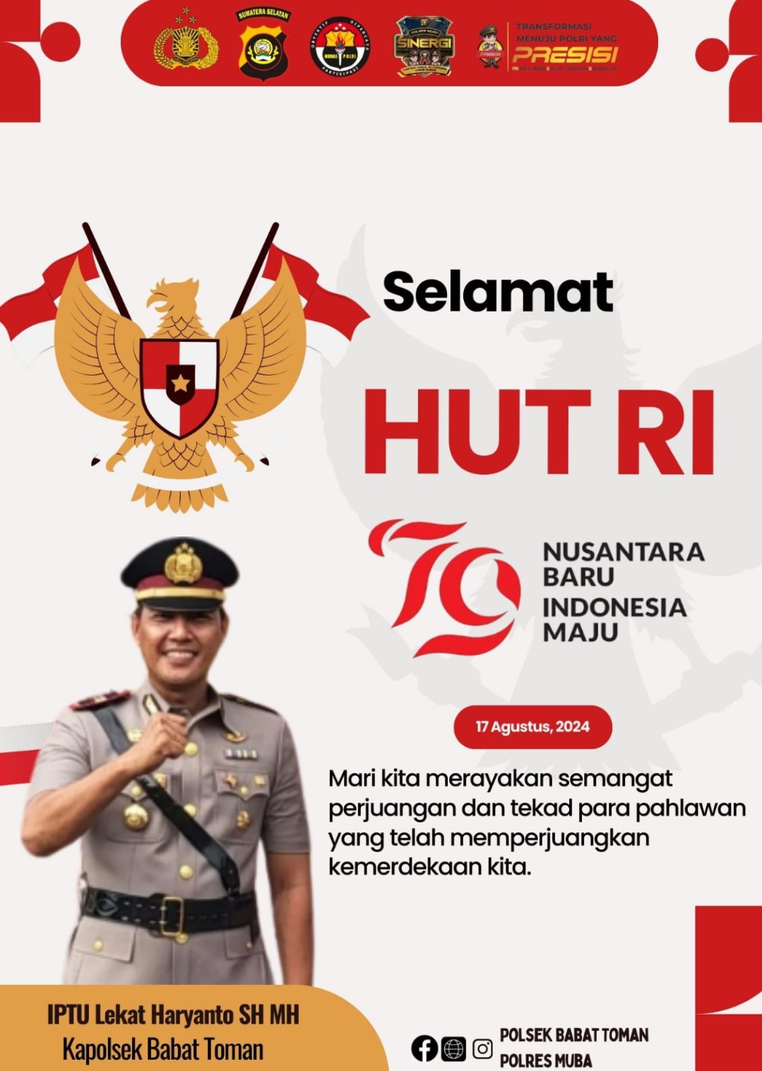 MUBA,JR.ID – Kapolsek Babat Toman IPTU Lekat Haryanto SH MH beserta jajaran Mengucapkan Selamat Hari Kemerdekaan RI Ke-79 Tahun “Nusantara Baru, Indonesia Maju”.