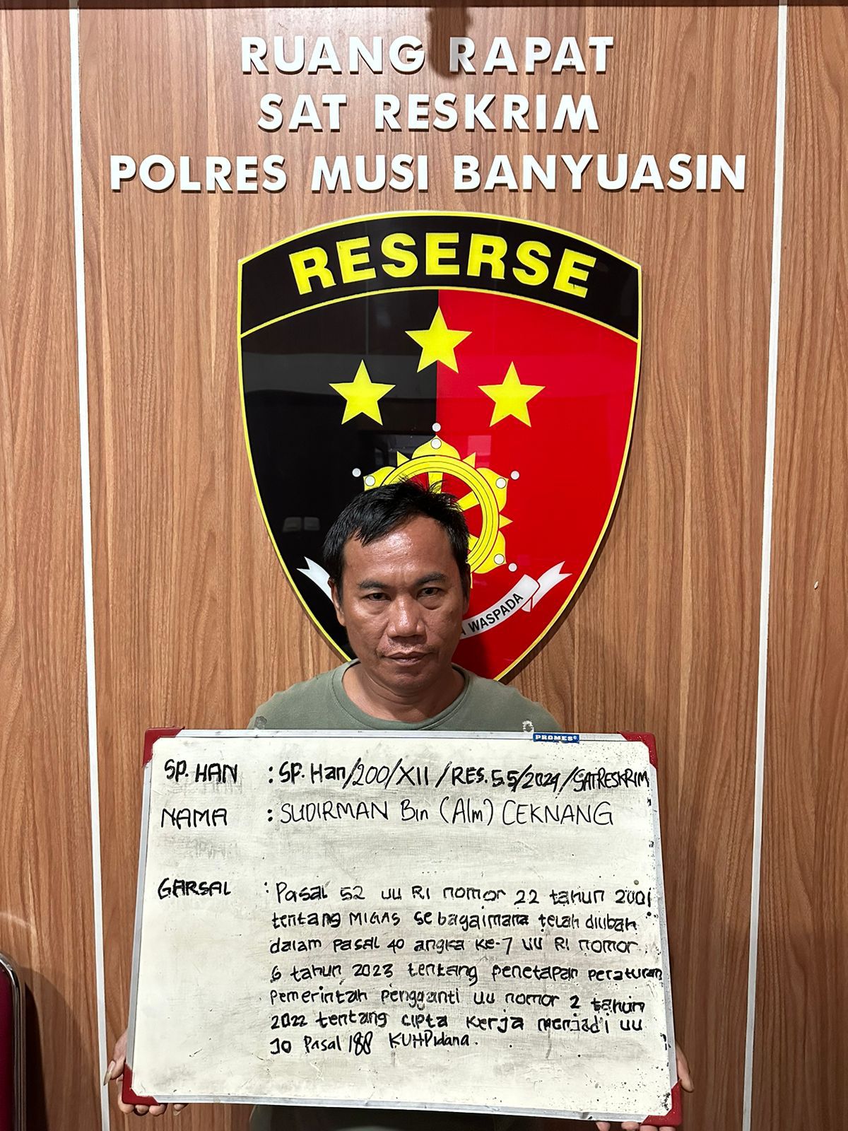 Berdasarkan keterangan yang dihimpun dari para saksi, Kanitreskrim IPDA Heri Fitha SH bersama personil Polsek Sanga Desa melakukan penangkapan terhadap Sudirman Warga Desa Sereka yang pemilik Sumur Minyak tersebut.