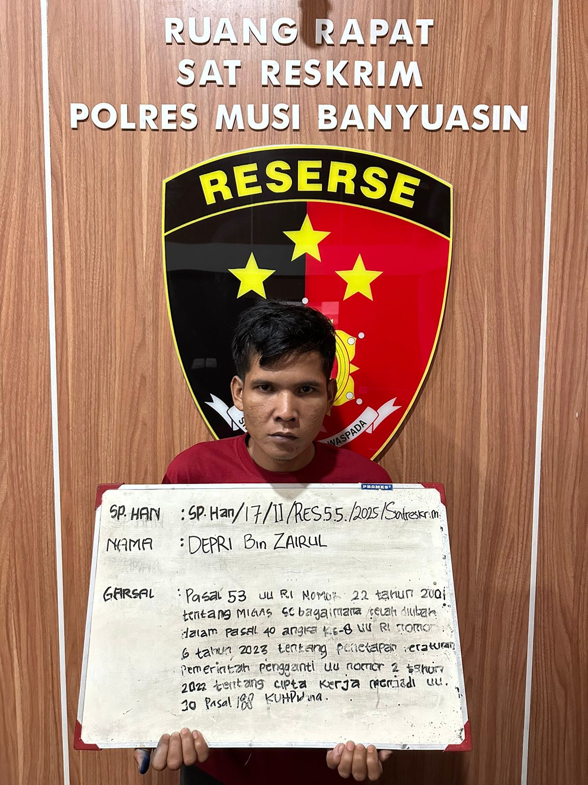 Tersangka atas nama Depri (29) warga Desa Teluk Kijing II Kecamatan Lais yang merupakan pemilik dari penyulingan ilegal terbakar, berhasil diamankan Tim Unit Reskrim Polsek Keluang.penangkapan tersebut dilakukan setelah pihak kepolisian melakukan gelar perkara dan mendapati alat bukti yang cukup.