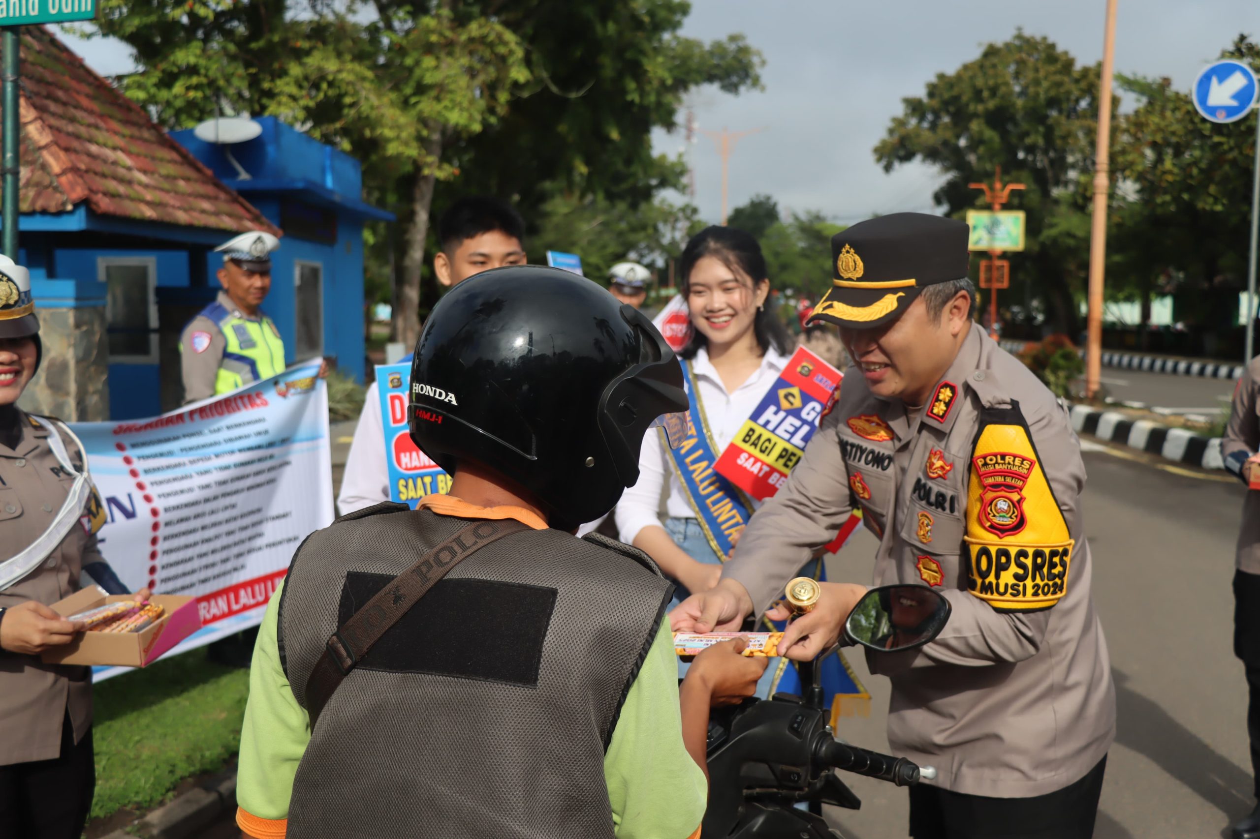 Polres Musi Banyuasin dipimpin langsung oleh Kapolres Musi Banyuasin AKBP Listiyono Dwi Nugroho, SIK, MH membagikan Cokelat “Kasih Sayang” kepada pengendara di jalan raya yang tertib berlalu lintas.
