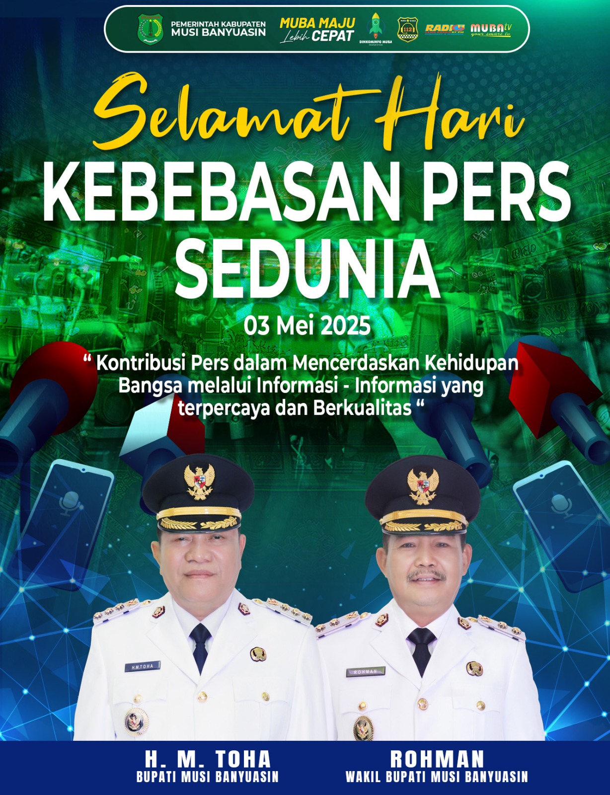 Bupati Musi Banyuasin, HM Toha, dan Wakil Bupati, Kiyai Rohman, menyerukan kepada seluruh warga untuk menjadi garda terdepan melawan berita bohong (hoax). “Mari kita verifikasi setiap informasi sebelum membagikannya. Jadilah warganet yang bijak!” Hari ini, kita memperingati Hari Kebebasan Pers Dunia, sebuah kesempatan untuk mengapresiasi peran penting pers dalam masyarakat. Namun, di tengah kebebasan pers, kita juga harus waspada terhadap berita hoax yang dapat merusak kehidupan kita. tegasnya
