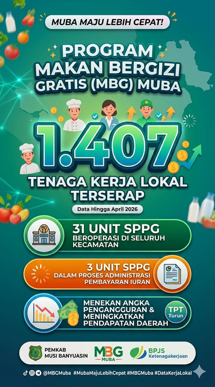 Kehadiran Satuan Pelayanan Pemenuhan Gizi (SPPG) di 31 titik operasional telah menjadi motor penggerak lowongan kerja baru bagi masyarakat Musi Banyuasin. Dengan terserapnya 1.407 pekerja, program ini secara langsung berkontribusi pada penurunan Tingkat Pengangguran Terbuka (TPT) di wilayah Musi Banyuasin ungkap Kadisnakertrans Musi Banyuasin Herryandi Sinulingga AP Kamis (9/4)