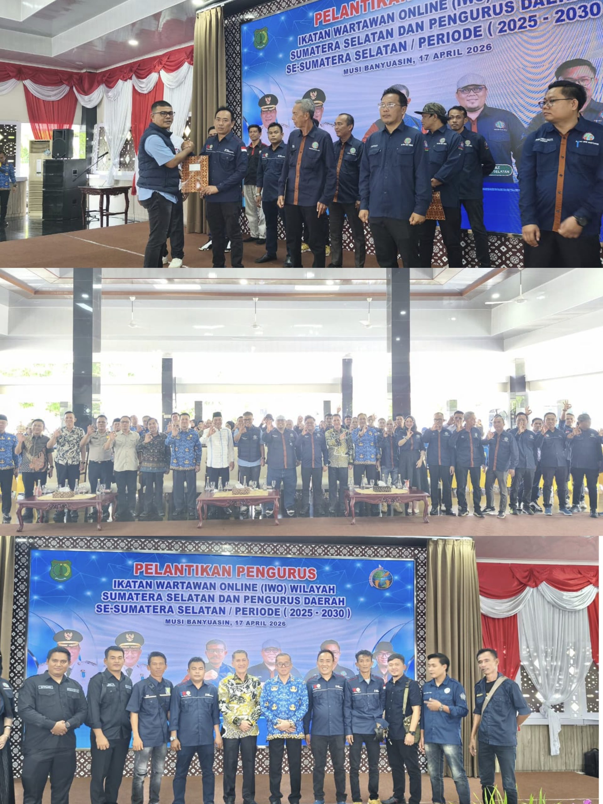 MUBA|Jembatanrakyat.id– Pelantikan Pengurus Daerah Ikatan Wartawan Online (IWO) se-Sumatera Selatan berlangsung khidmat dan serentak di Kabupaten Musi Banyuasin. Kegiatan ini dipusatkan di Pendopoan Griya Bumi Serasan Sekate pada Jumat (17/4/2026), menjadi momentum penting dalam memperkuat eksistensi dan profesionalisme media online di tingkat daerah.