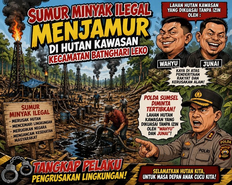 MUBA,JR.ID – Eskalasi sumur minyak Ilegal hasil berkembang pesatnya pengeboran yang dilakukan oknum mafia bernama “Wahyu” dan “Junai” di Hutan Kawasan yang berada di Kecamatan Batanghari Leko, Kabupaten Musi Banyuasin kini menjadi sorotan.